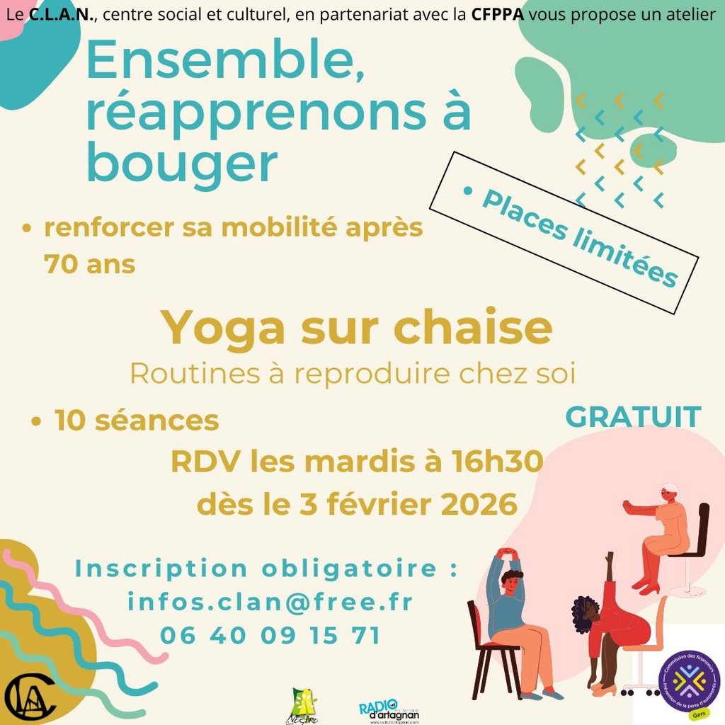 Vous avez 70, 80 ans ou plus, peu ou pas du tout de pratique sportive et ce parfois depuis de nombreuses années, le centre social et culturel le CLAN en partenariat avec la CFPPA vous propose 10 séances gratuites de Yoga sur chaise