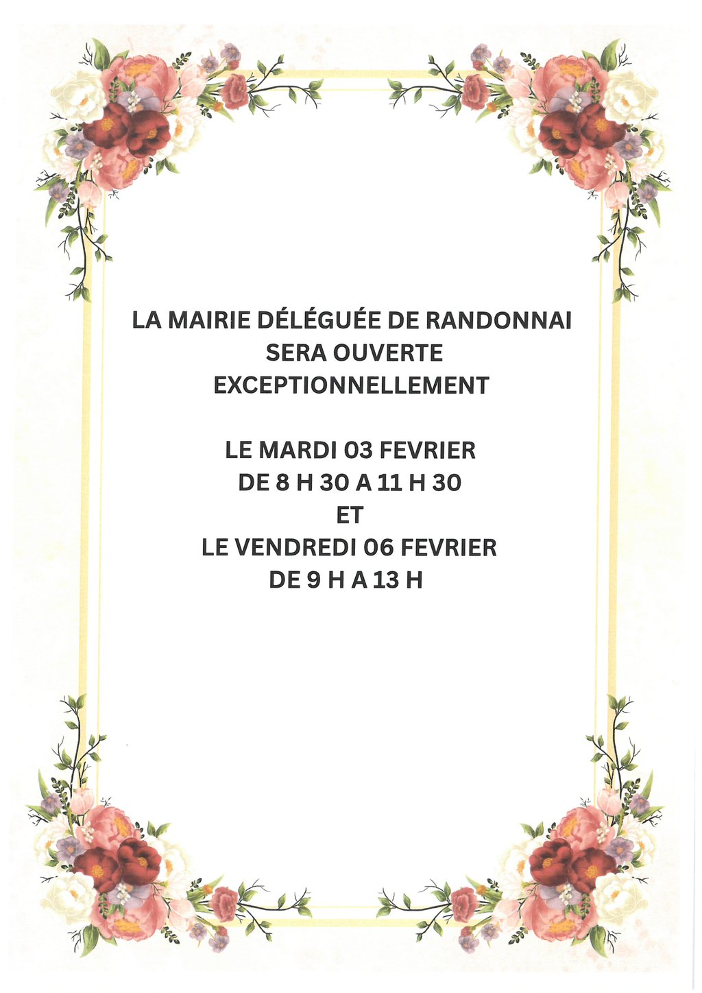 LA MAIRIE DÉLÉGUÉE DE RANDONNAI SERA OUVERTE EXCEPTIONNELLEMENT :