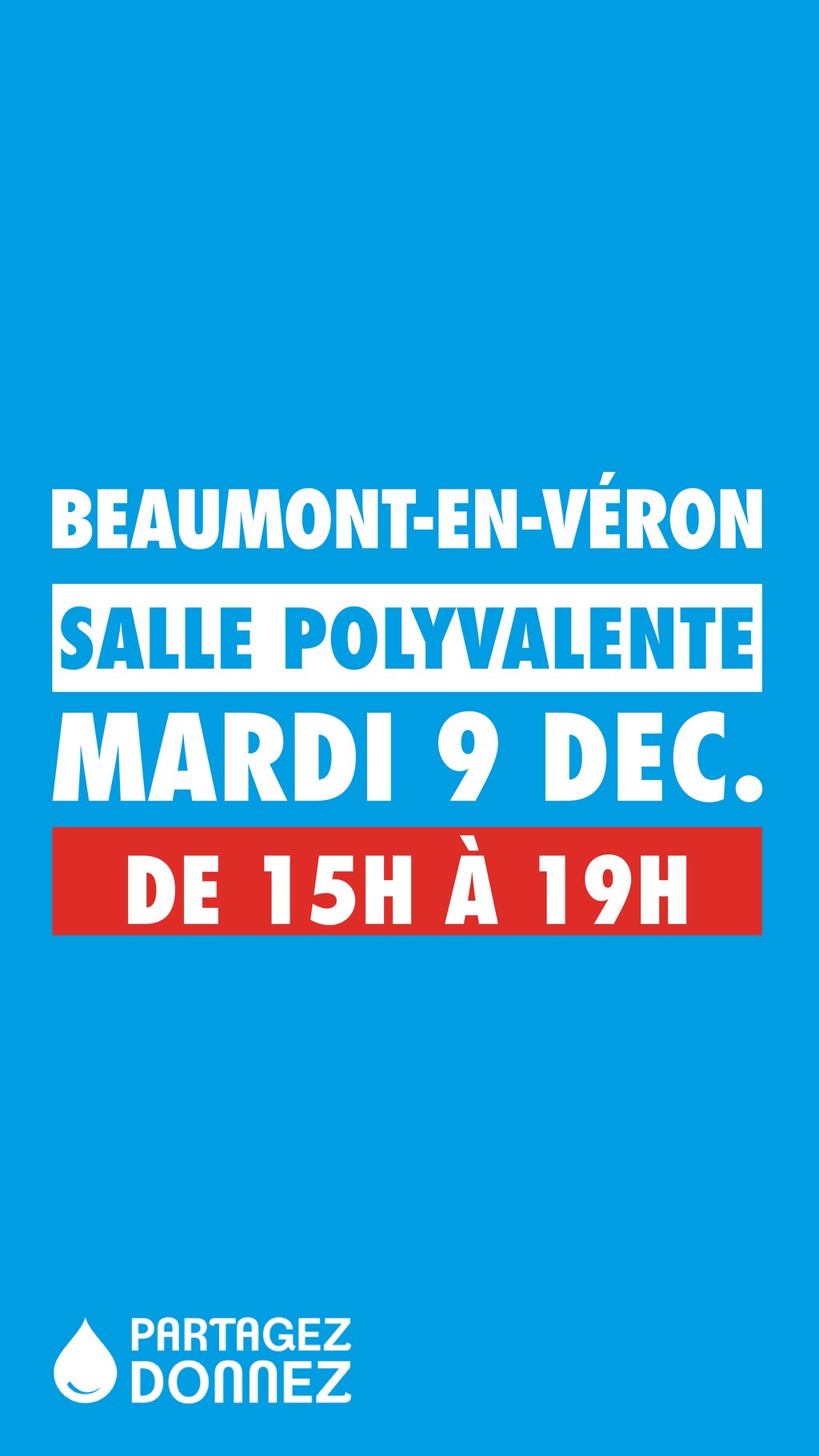 La prochaine collecte de don de sang aura lieu le Mardi 9 décembre de 15h à 19h à la Salle polyvalente de Beaumont-en-Véron.