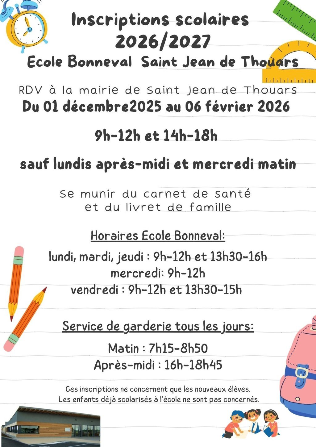 Les inscriptions scolaires pour la rentrée 2026 seront prises à la mairie de Saint-Jean-de-Thouars du lundi 1er décembre 2025 jusqu'au vendredi 6 février 2026, les jours ouvrés, de 9h à 12h et de 14h à 18h, sauf les lundis après-midi et mercredis matin. Se munir du carnet de santé et du livret de famille. Ces inscriptions ne concernent que les nouveaux élèves. Les enfants déjà scolarisés à l'école ne sont pas concernés.