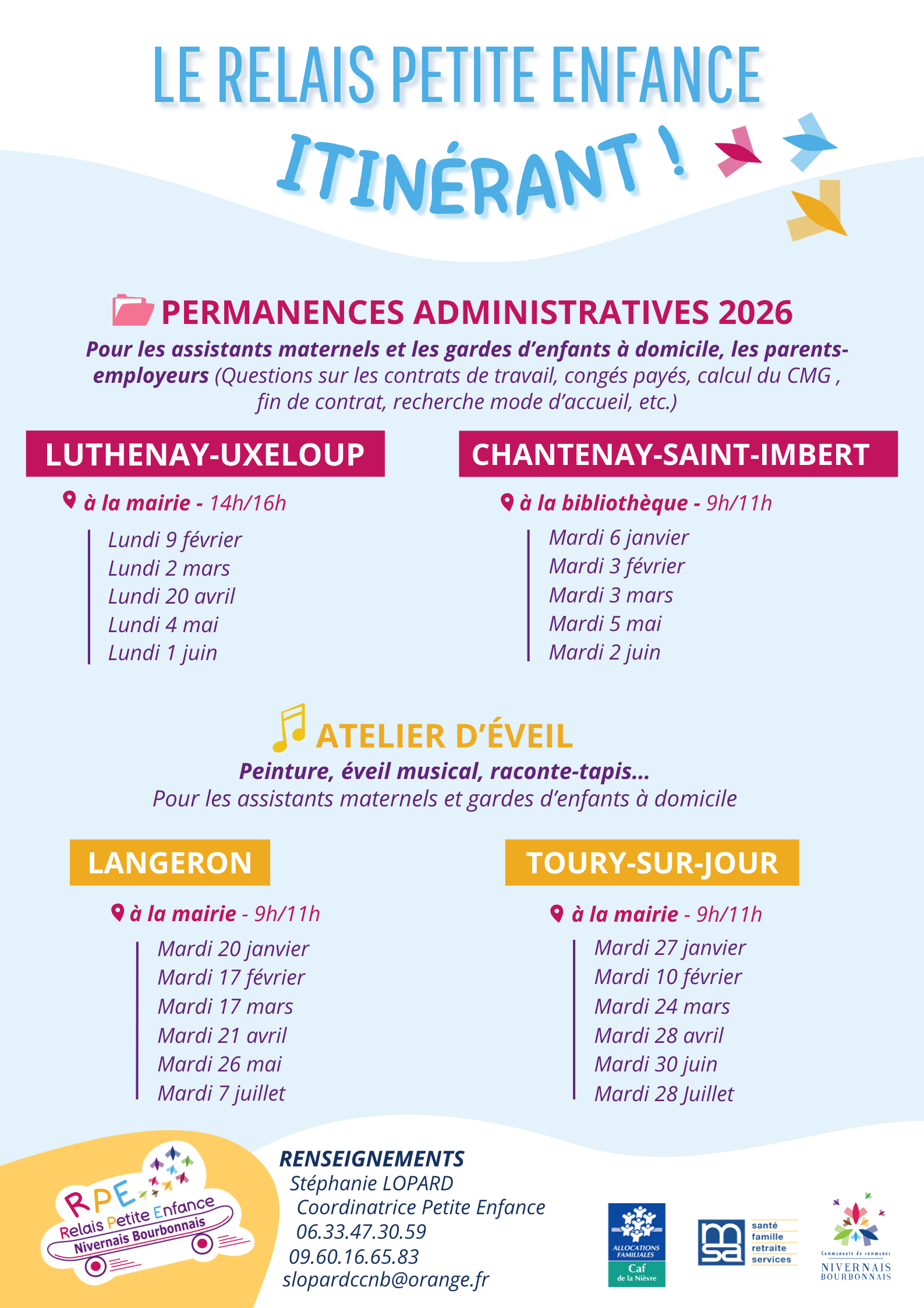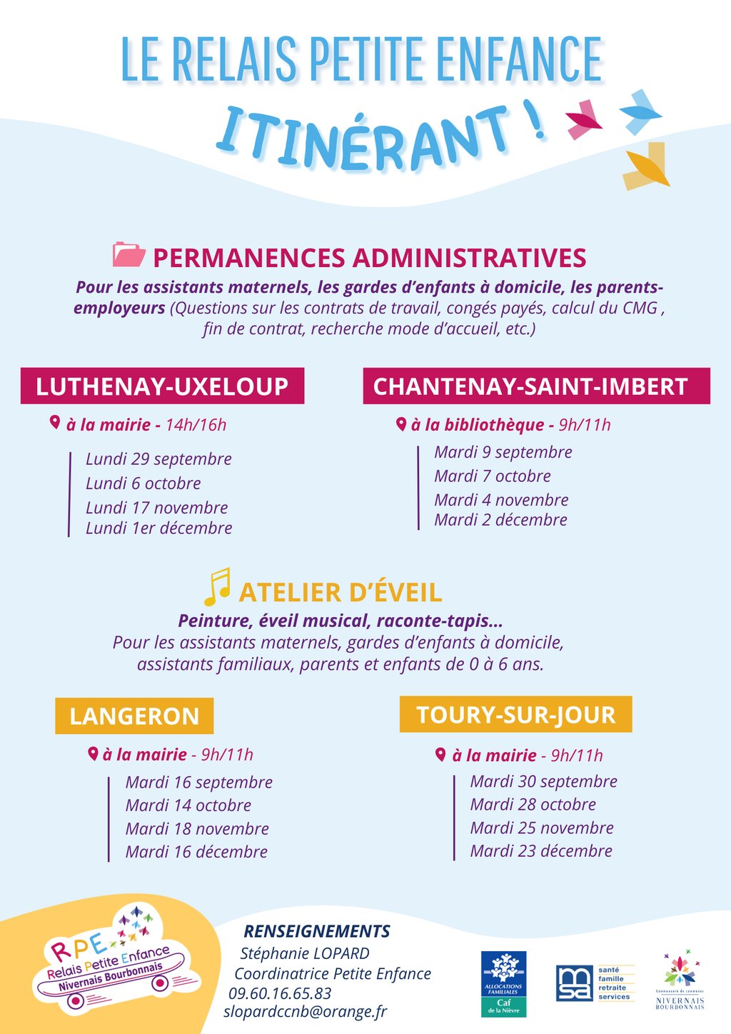 Veuillez trouver ci-joint le calendrier des itinérances du Relais Petite Enfance.