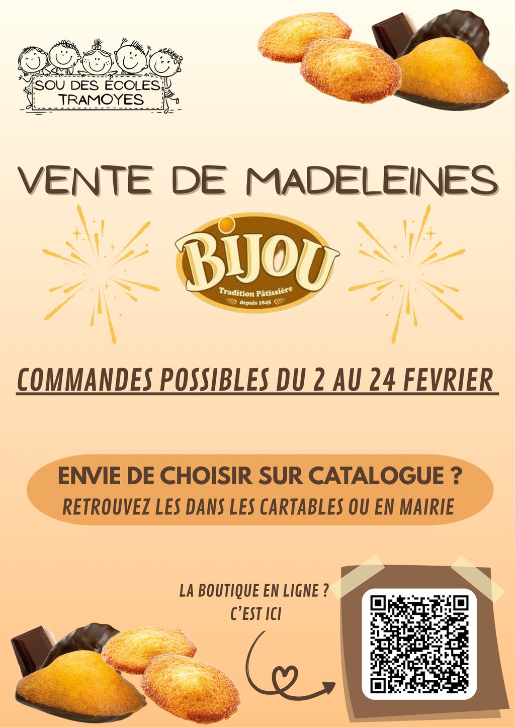 Commande possible par HelloAsso (https://www.helloasso.com/associations/sou-des-ecoles-de-tramoyes/boutiques/vente-madeleines-et-gateaux-bijou-2026) ou par bon de commande !
