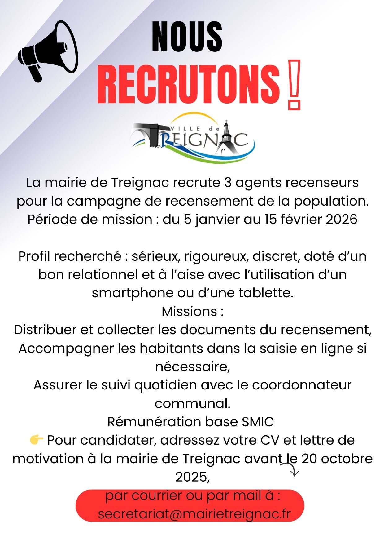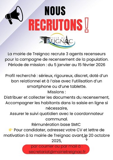 La mairie de Treignac recrute 3 agents recenseurs pour la campagne de recensement de la population 2026.