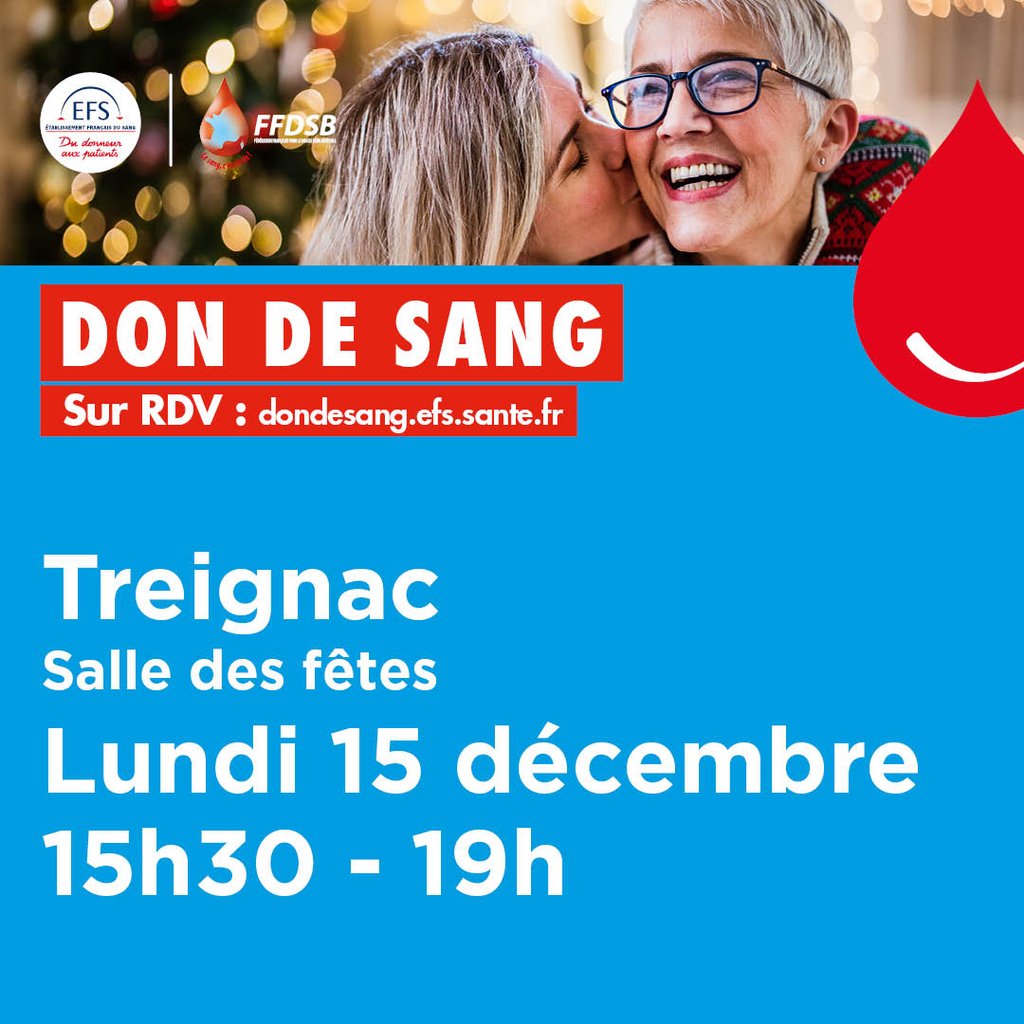 Lundi 15 décembre de 15 h 30 à 19h à la salle des fêtes de Treignac