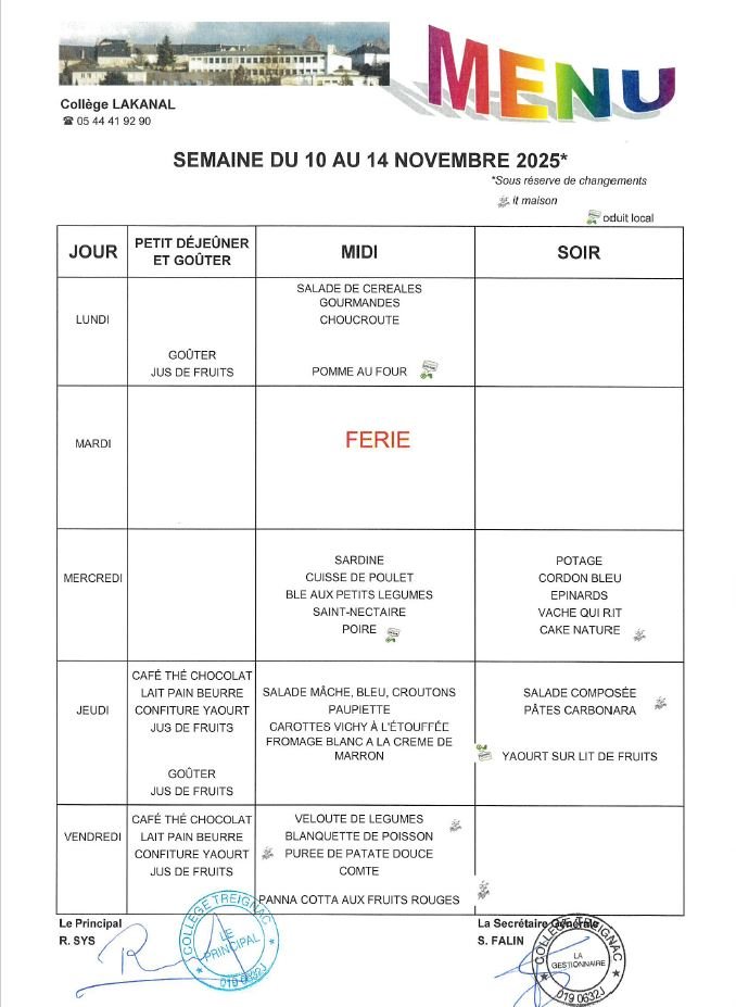 Menu du 10 au 14 novembre 2025 pour le collège Lakanal et l'école Camille Fleury