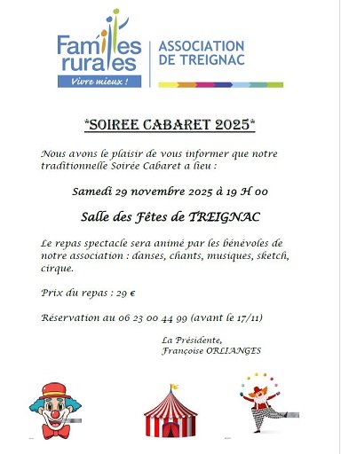 La soirée cabaret aura lieu le samedi 29 novembre 2025 à 19h à la salle des fêtes de treignac