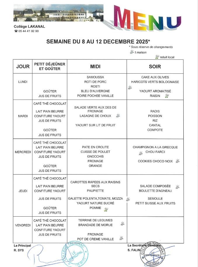 MENU DU 8 AU 12 DÉCEMBRE 2025