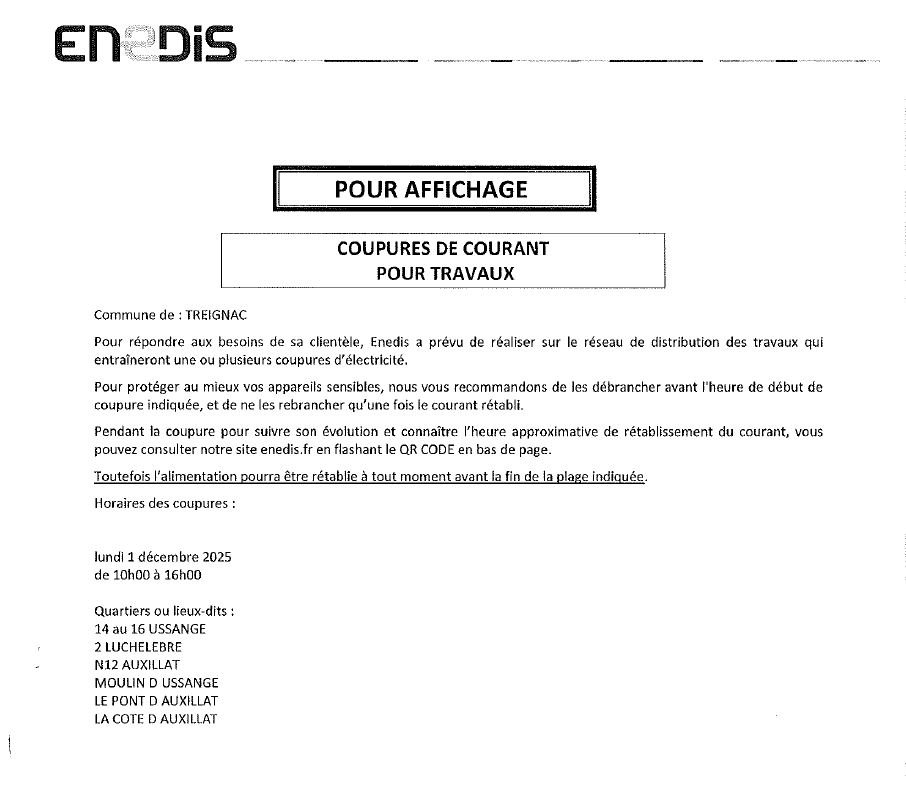 Coupure de courant prévu par EDF le 1er décembre de 10h à 16h