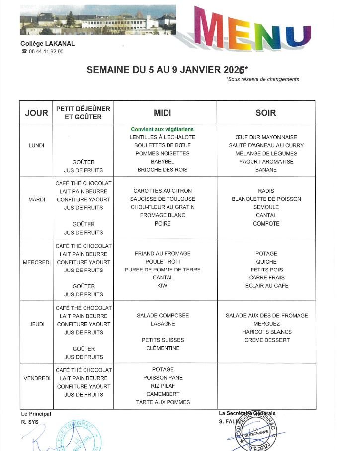 MENU CANTINE DU 5 AU 9 JANVIER 2026