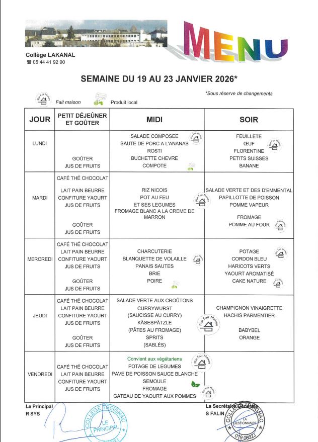 MENU DE LA CANTINE DU 19 AU 23 JANVIER 2026