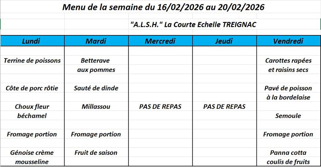 MENU DES VACANCES DE L'ALSH DU LUNDI 16 AU VENDREDI 20 FÉVRIER