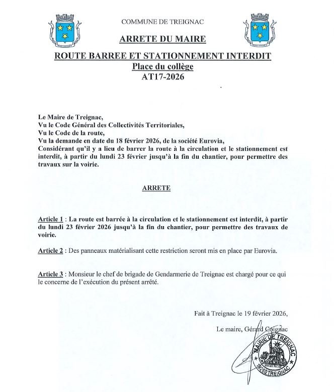 Plus d'informations ⇾ https://www.mairietreignac.fr/arretes-municipaux