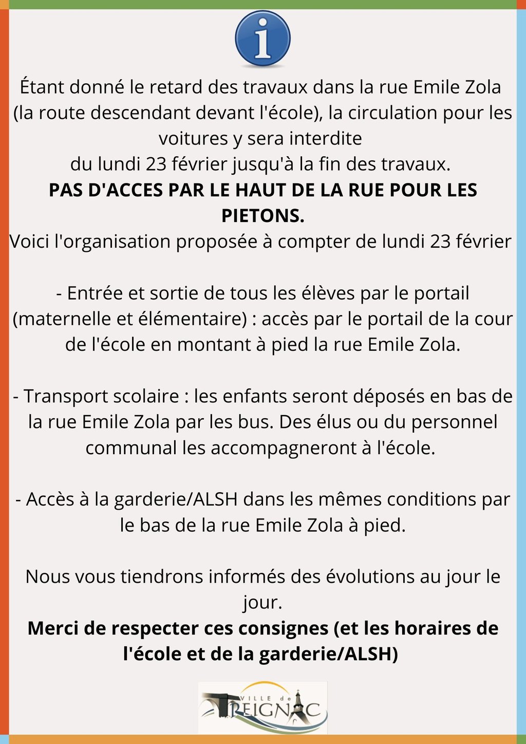 - Transport scolaire : les enfants seront déposés en bas de la rue Emile Zola par les bus. Des élus ou du personnel communal les accompagneront à l'école.
