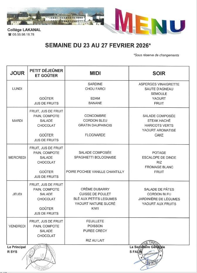 MENU DE LA CANTINE DU 23 AU 27 FÉVRIER 2026
