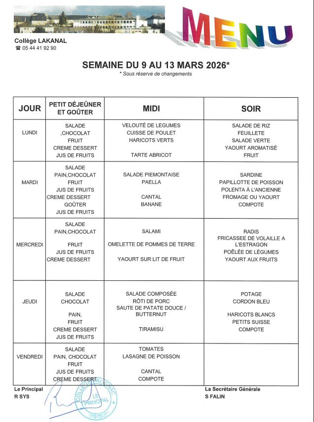 MENU DE LA CANTINE SCOLAIRE DU 9 AU 13 MARS 2026