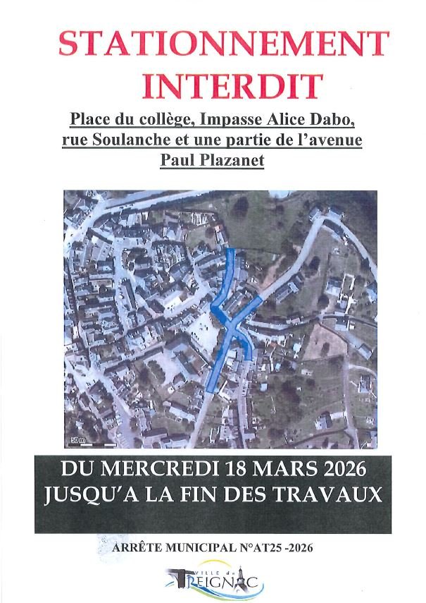 Considérant qu’il y a lieu d’interdire le stationnement et que la circulation sera interdite aux poids lourds au niveau de la Place du collège, impasse Alice Dabo, rue Soulanche et une partie de l’avenue Paul Plazanet à partir du mercredi 18 mars 2026 jusqu’à la fin des travaux pour permettre l’enrobé sur trottoir et la pose de signalisation.