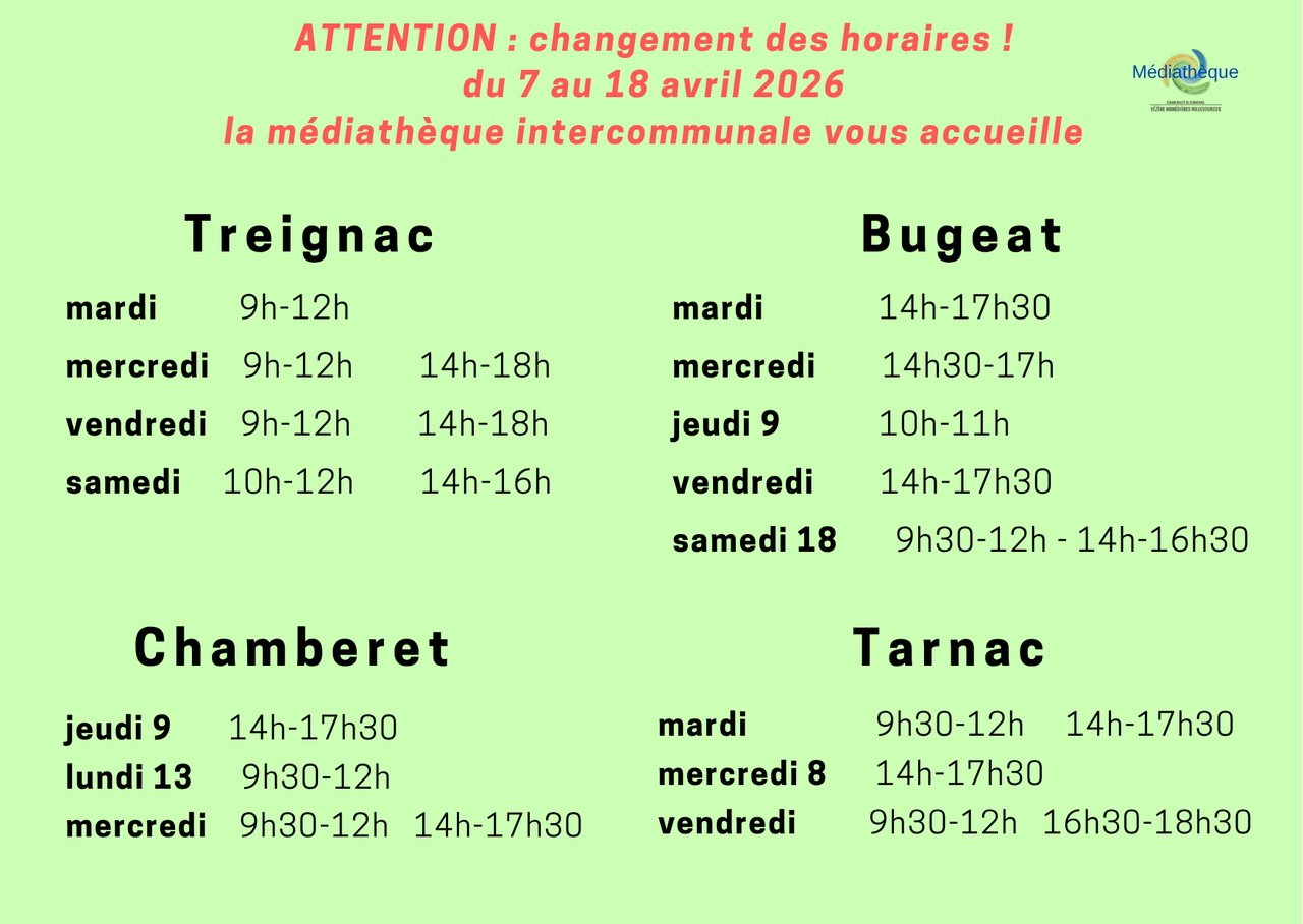 Attention changement des horaires d'ouverture du 7 au 18 avril.