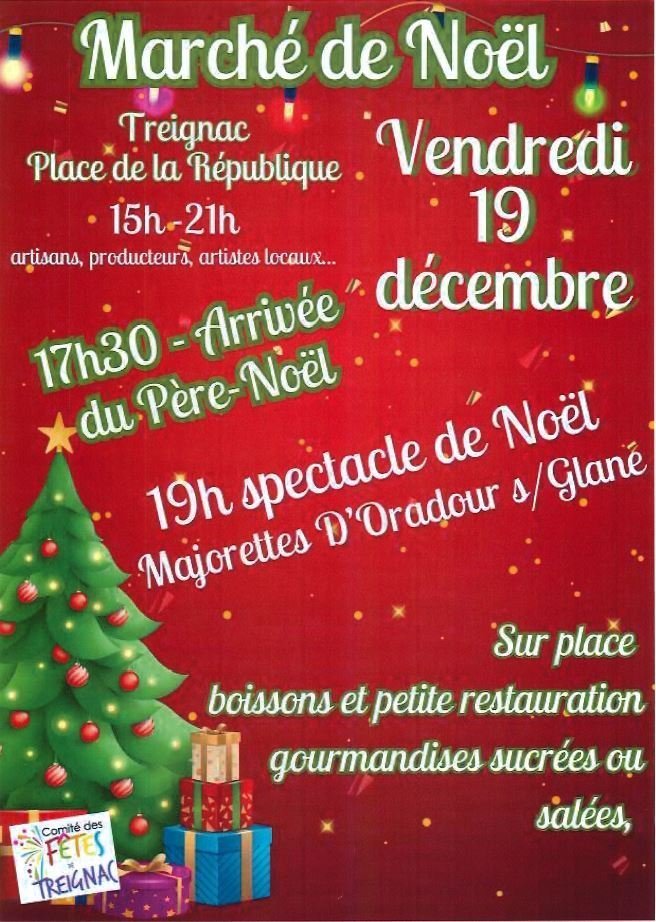 Retrouvez-nous au marché de Noël qui se tiendra place de la République, nombreux exposants de bouche et d'artisanat seront présents, à 17h30 arrivée du Père Noël, à 19h00 spectacle avec les Majorettes d'Oradour sur Glane.