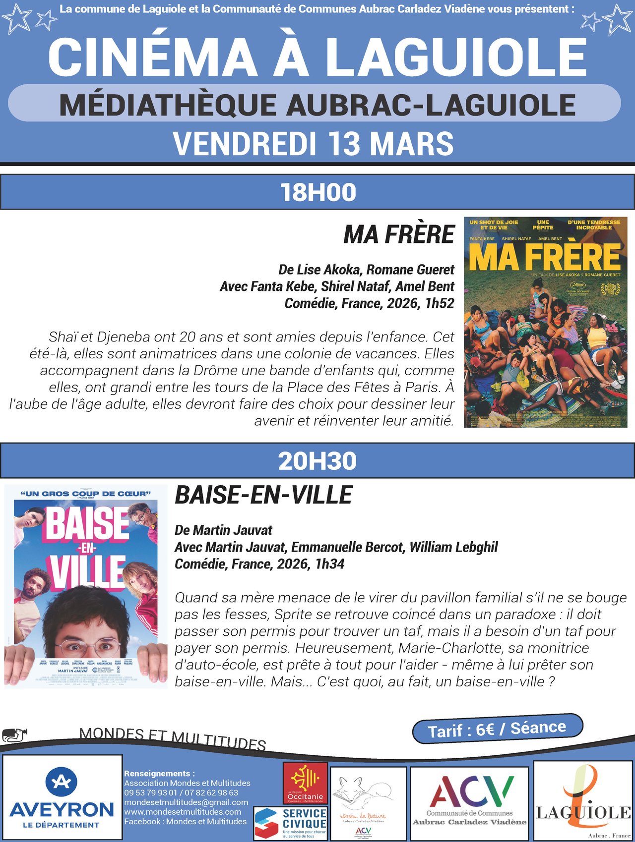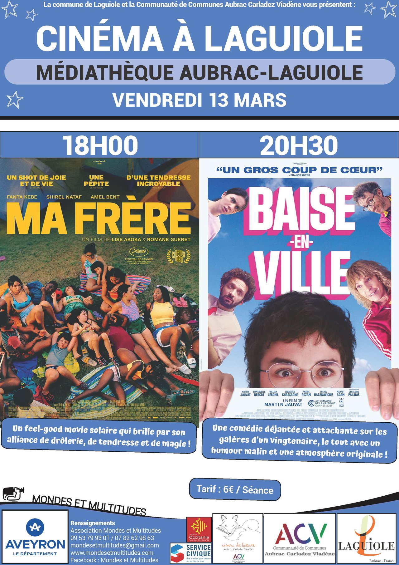 En partenariat avec Mondes et Multitudes et la commune de Laguiole, la médiathèque Aubrac-Laguiole recevra, le 𝘃𝗲𝗻𝗱𝗿𝗲𝗱𝗶 𝟭𝟯 𝗺𝗮𝗿𝘀, deux nouvelles séances de cinéma itinérant.