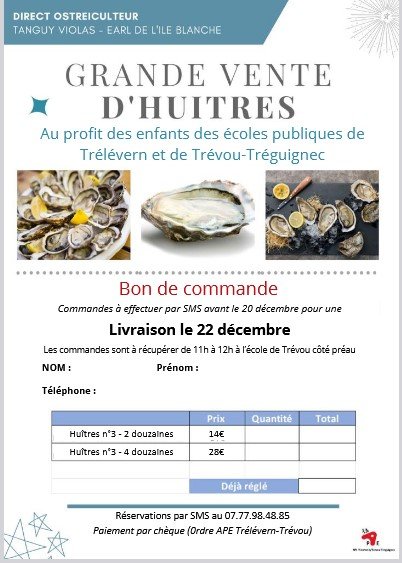 Les Parents d’élèves des écoles publiques (RPI) de Trélévern et Trévou-Tréguignec proposent une vente d’huîtres le 22 décembre de 11h à midi (sous le préau de l’école publique – bas du bourg côté Trélévern)