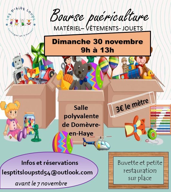 L'association Les P'tits Loups organise une bourse puériculture le dimanche 30/11/2025 de 9h à 13h à la salle polyvalente de Domèvre en Haye.