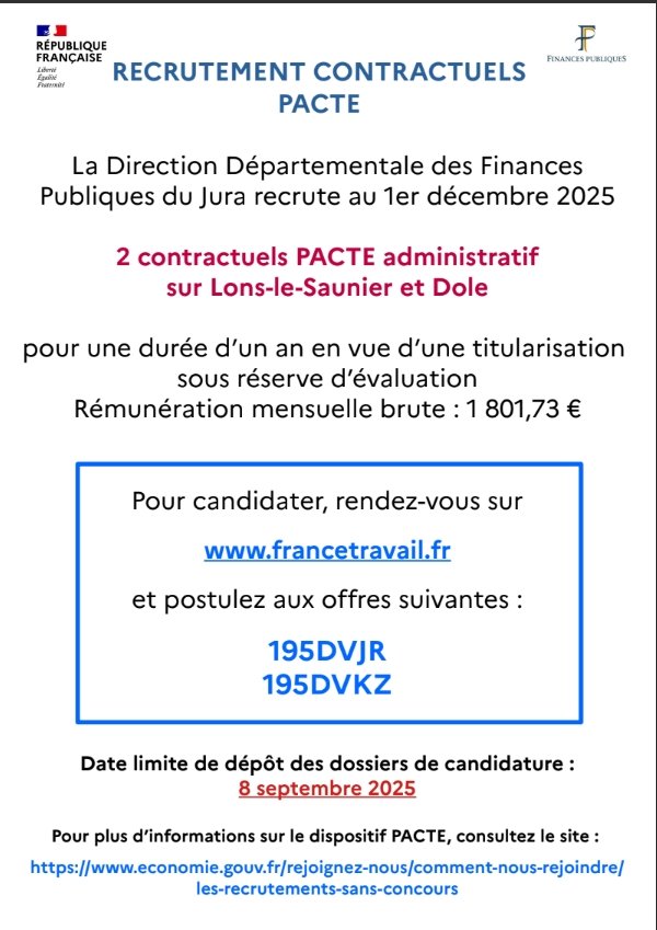 Dans le cadre de la campagne de recrutement par voie PACTE au titre de l'année 2025, la Direction Départementale des Finances Publiques du Jura adresse les fiches de déclaration des offres aux mairies pour affichage.