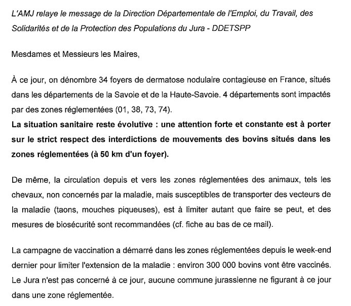 Vous trouverez, ci-joint un courrier de l’Association des Maires du Jura relatif des risques sanitaires pour les bovins et chevaux