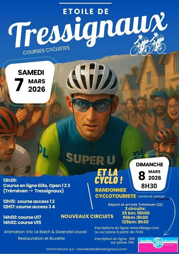 Deux jours d'animation autour du vélo, le samedi , courses cyclistes et le dimanche, randonnée cyclotouriste caritative à partir de 8h30 sur la commune de Tréméven. Restauration sur place.