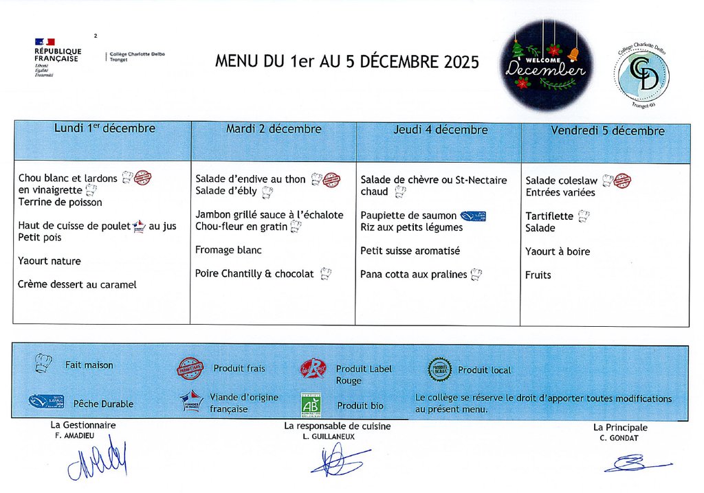 MENU DU 1ER AU 5 DÉCEMBRE 2025