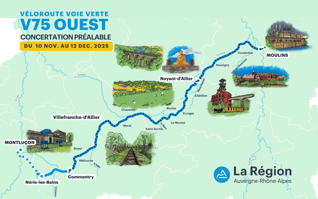 À partir d’aujourd’hui et jusqu’au 12 décembre 🗓️, la Région Auvergne-Rhône-Alpes organise une concertation préalable et invite chacune et chacun à donner son avis sur le projet de Véloroute Voie Verte V75 Ouest.
