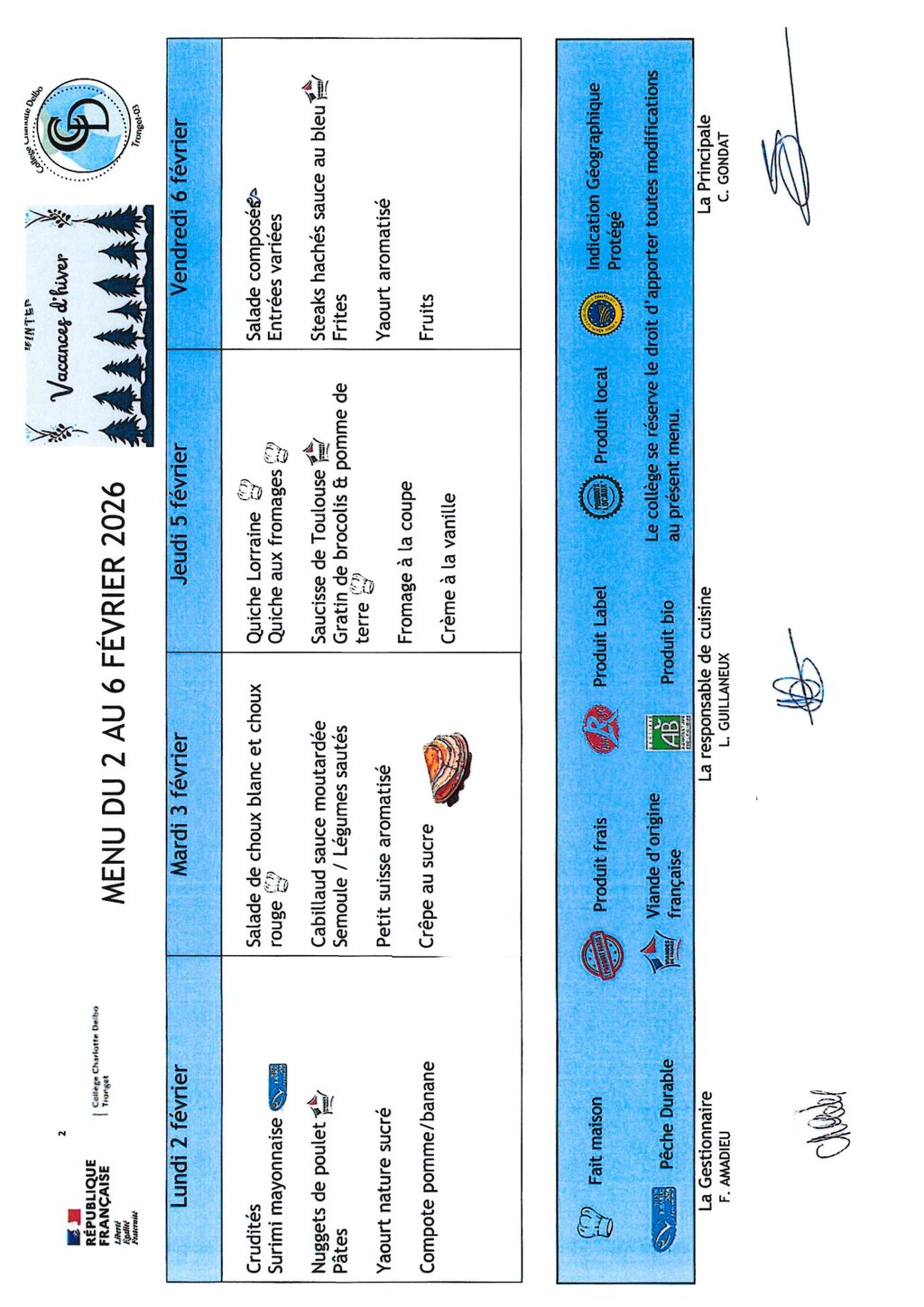 MENU CANTINE SEMAINE DU 2 AU 6 FÉVRIE...