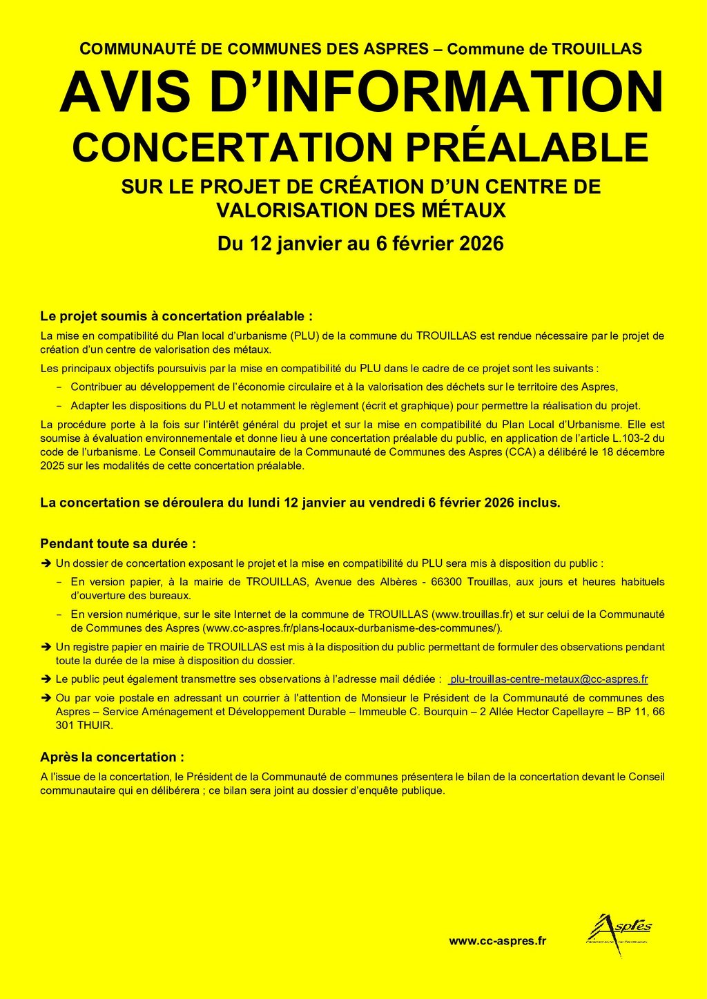 CONCERTATION PRÉALABLE DU LUNDI 12 JANVIER AU VENDREDI 6 FÉVRIER 2026
