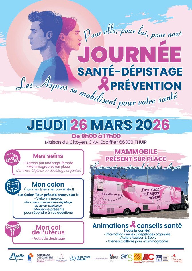 Le Contrat Local de Santé des Aspres organise sa deuxième journée Santé – Dépistage & Prévention, destinée aux habitants du territoire, le 26 mars 2026, à la Maison du Citoyen à Thuir.