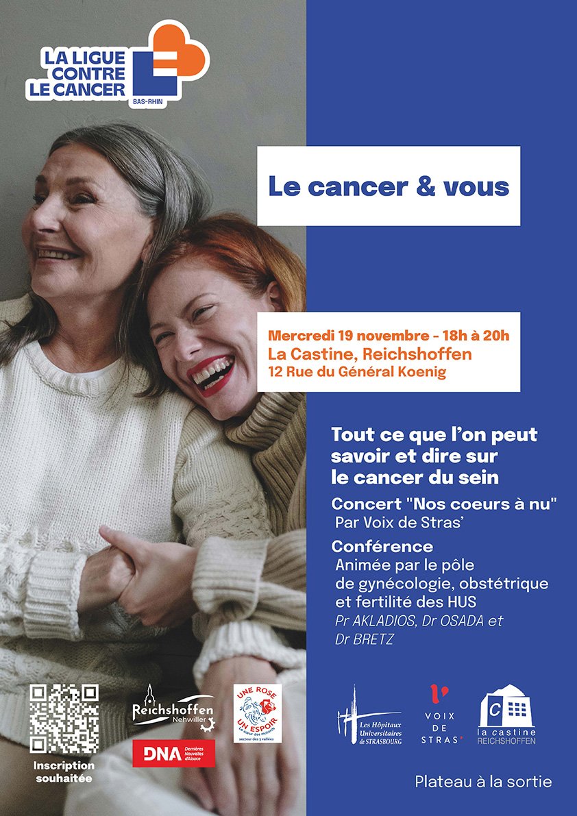 Retrouvez le concert "Nos cœurs à nu" par Voix de Stras’, suivie d’une conférence animée par le pôle de gynécologie, obstétrique et fertilité des HUS (Pr AKLADIOS, Dr OSADA et Dr BRETZ).