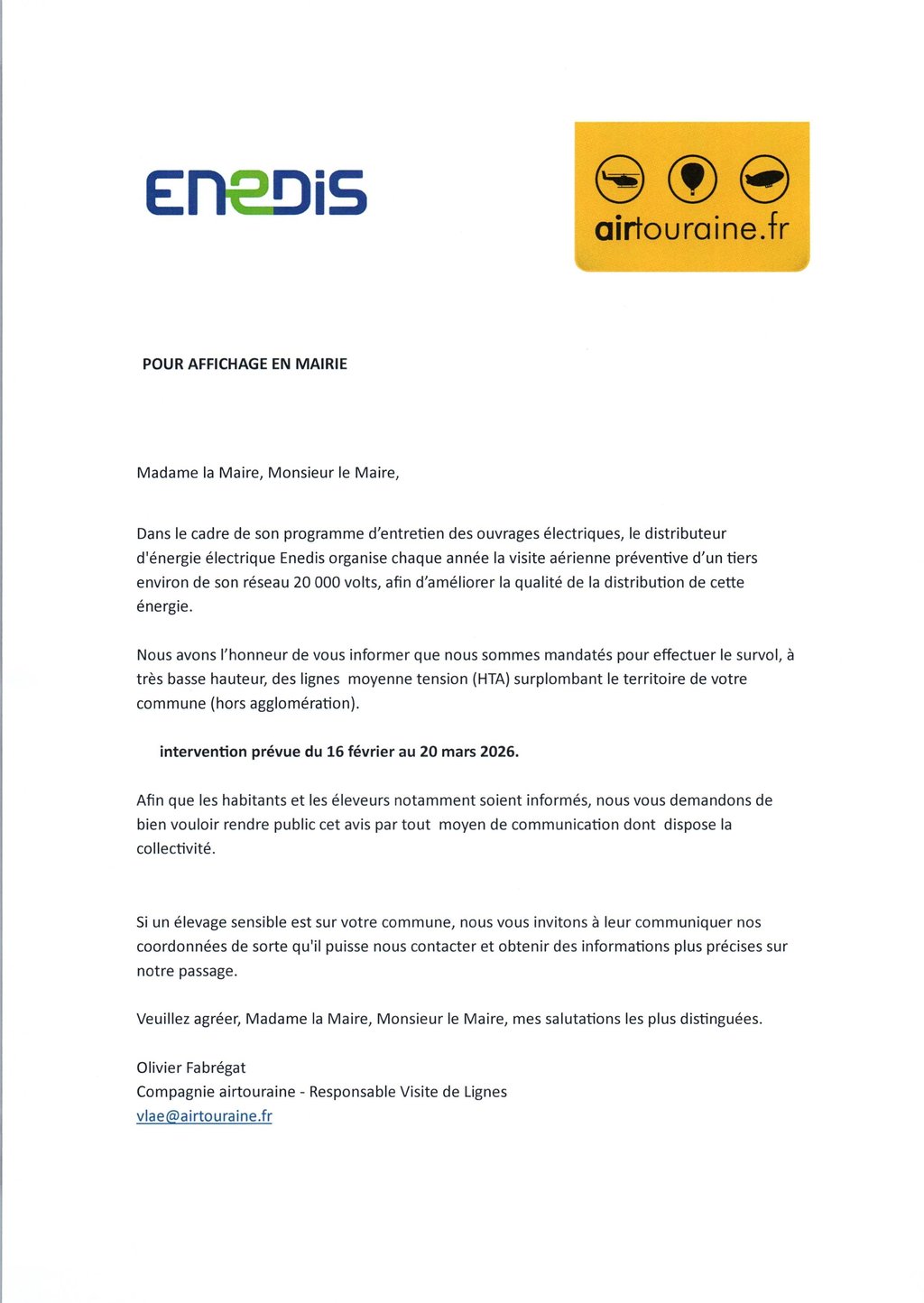 Nous avons l’honneur de vous informer que nous sommes mandatés pour effectuer le survol, à très basse hauteur, des lignes moyenne tension (HTA) surplombant le territoire de votre commune (hors agglomération).