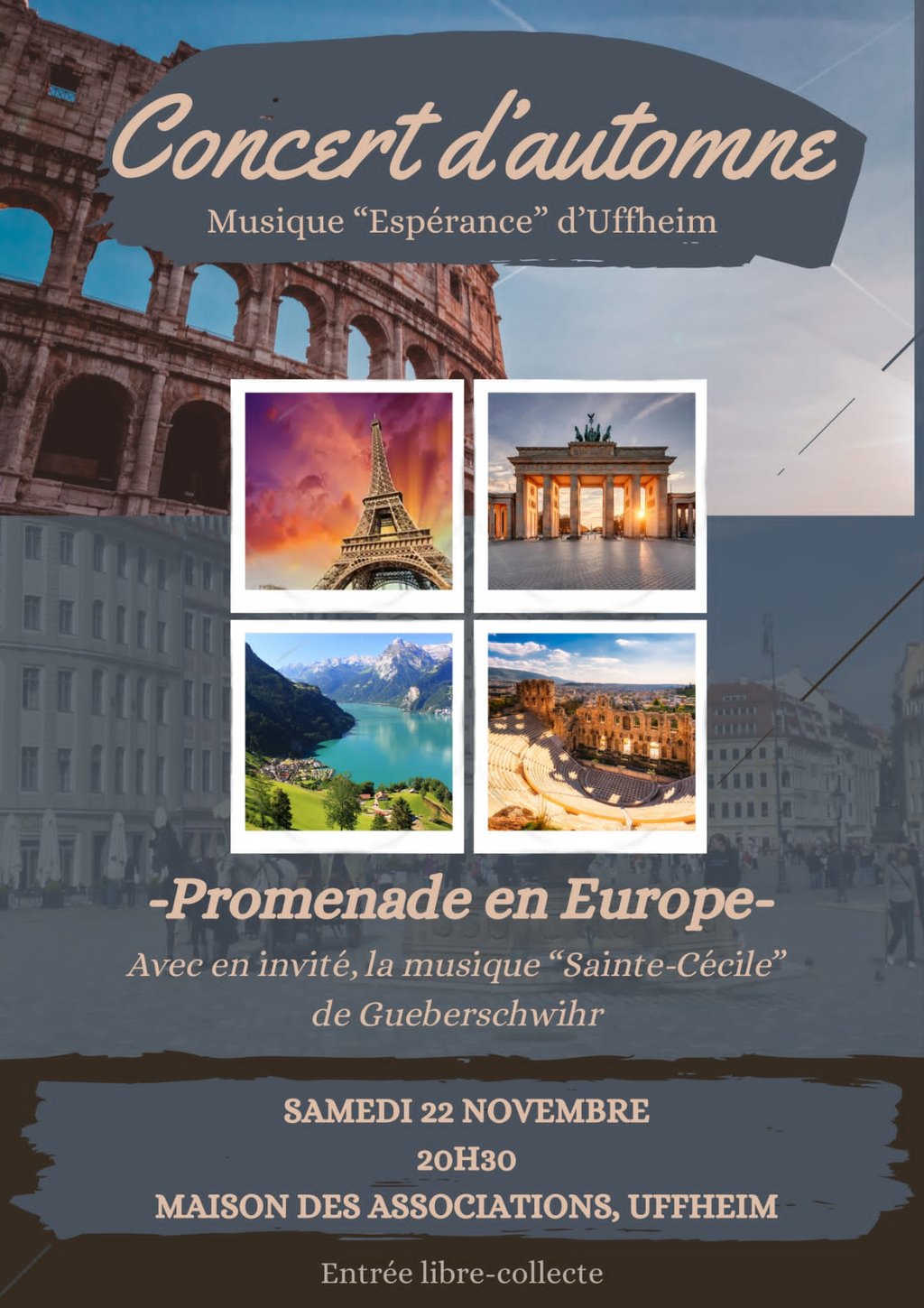 La Musique "Espérance" d’Uffheim vous invite à son concert d'Automne « Promenade en Europe » le samedi 22 novembre 2025 à 20h30 à la Maison des Associations d’Uffheim.