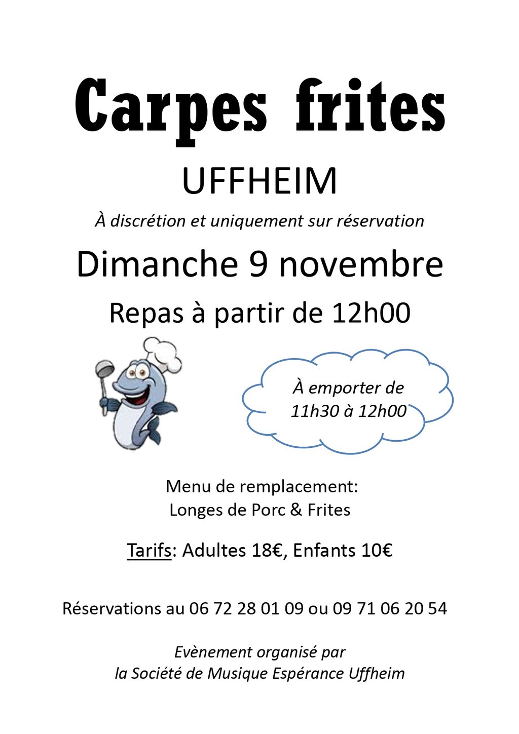 La Musique Espérance d'Uffheim organise un repas Carpes-Frites le dimanche 9 novembre 2025 à partir de 12h00 à la Maison des Associations.