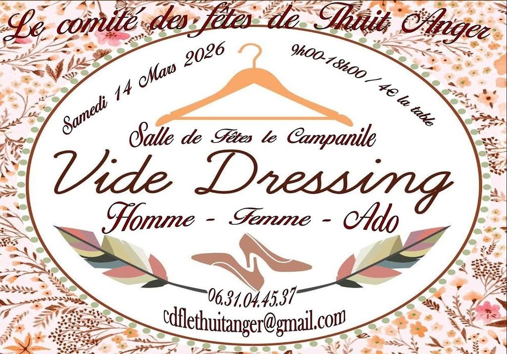 Le ComitĂ© des fĂȘtes de Thuit-Anger vous donne rendez-vous samedi 14 mars 2026 Ă la salle des fĂȘtes du Campanile pour un vide-dressing ouvert Ă toutes et tous.