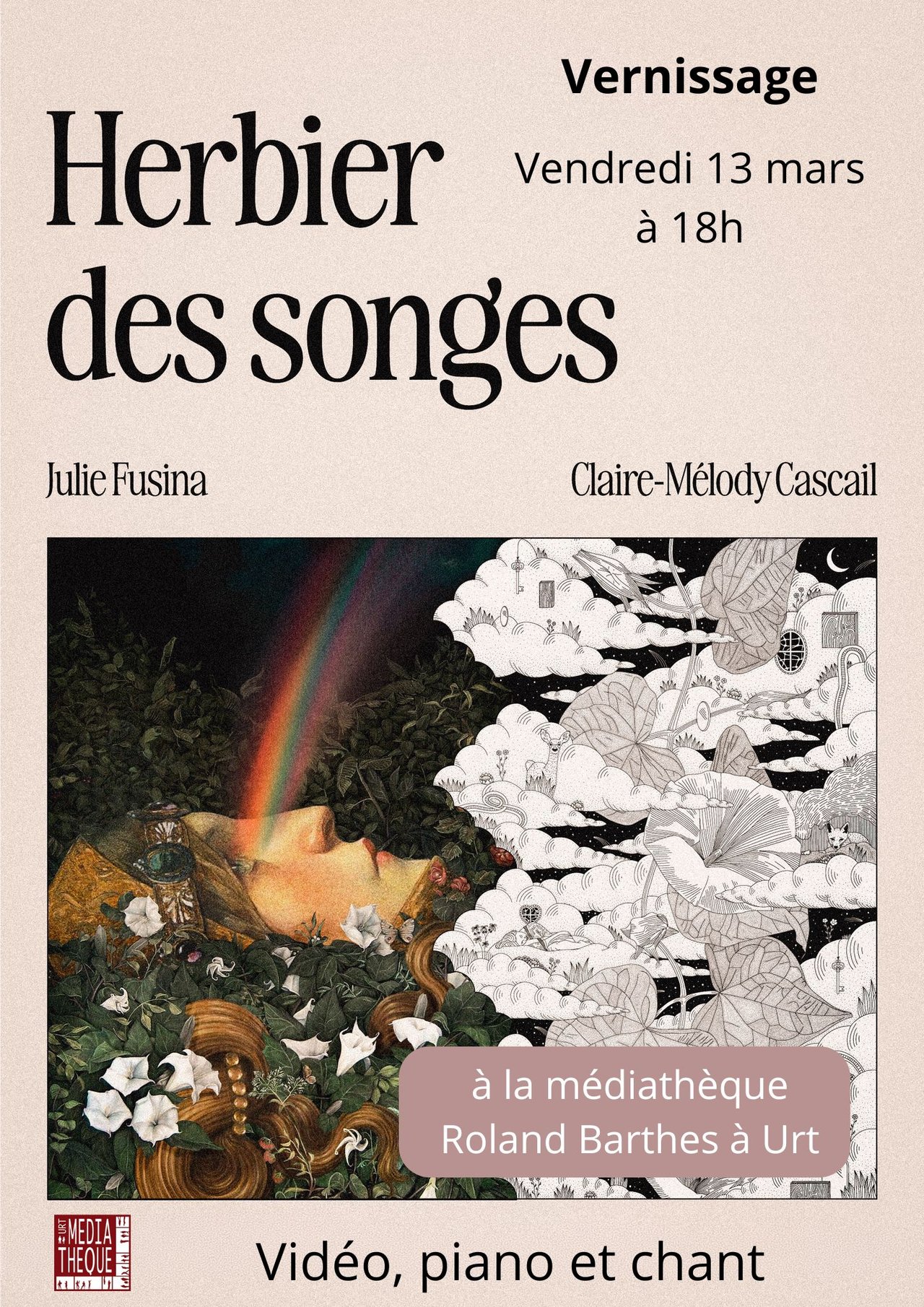 L'exposition de Julie fusina et claire-mélody Cascail “Herbier des songes” : dans les clairières du rêve, deux artistes locales glanent des fragments d’imaginaire. Leurs mains cousent des mondes où le réel vacille, où les collages respirent, où les couleurs chuchotent.