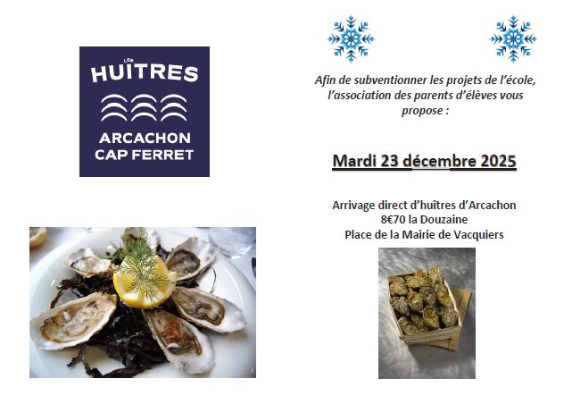 L'Association des Parents d’élèves de Vacquiers organise comme chaque année sa vente d'huîtres de chez Julien Becker.