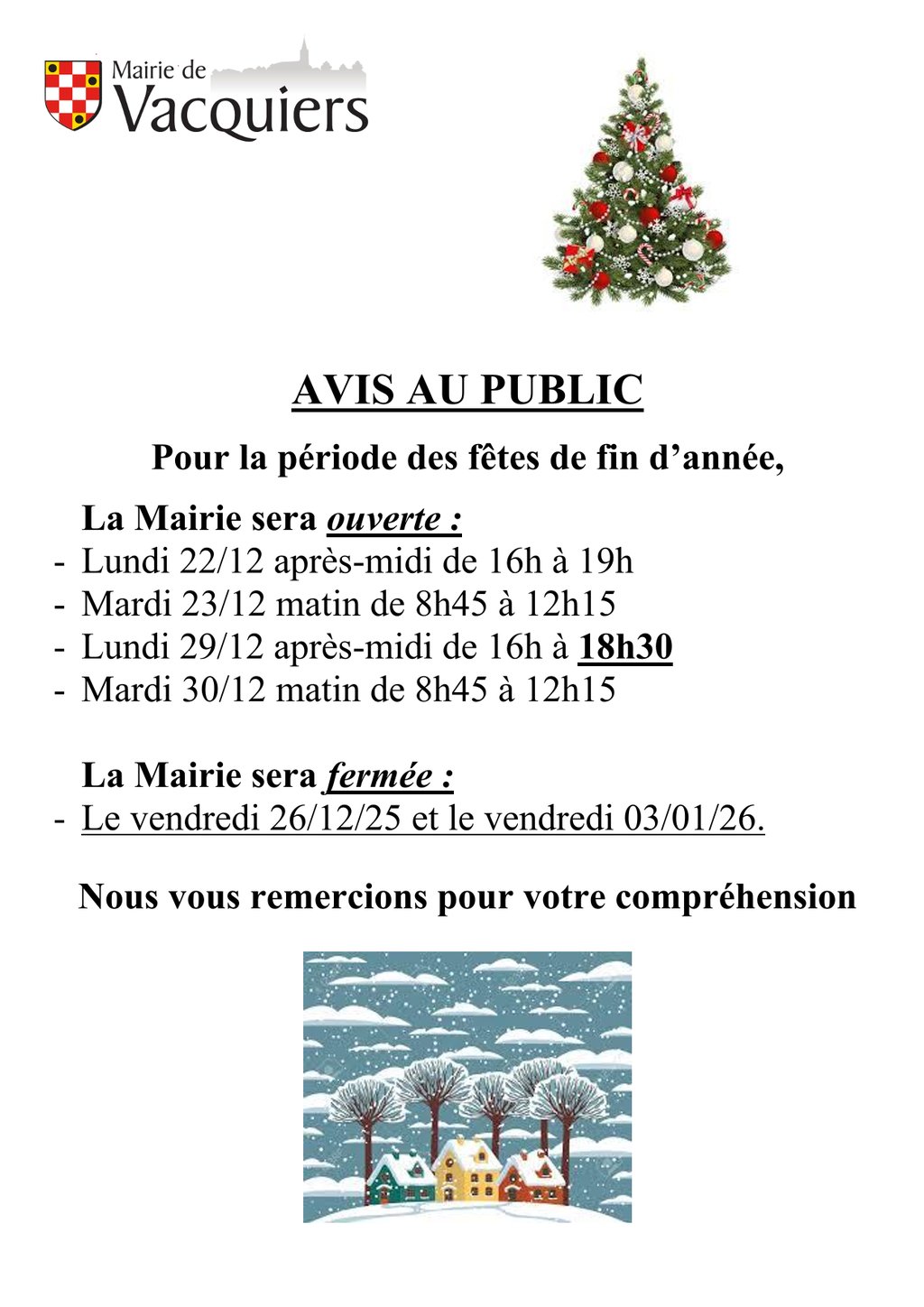 - La mairie sera fermée le vendredi 26/12/25 et le vendredi 03/01/26.