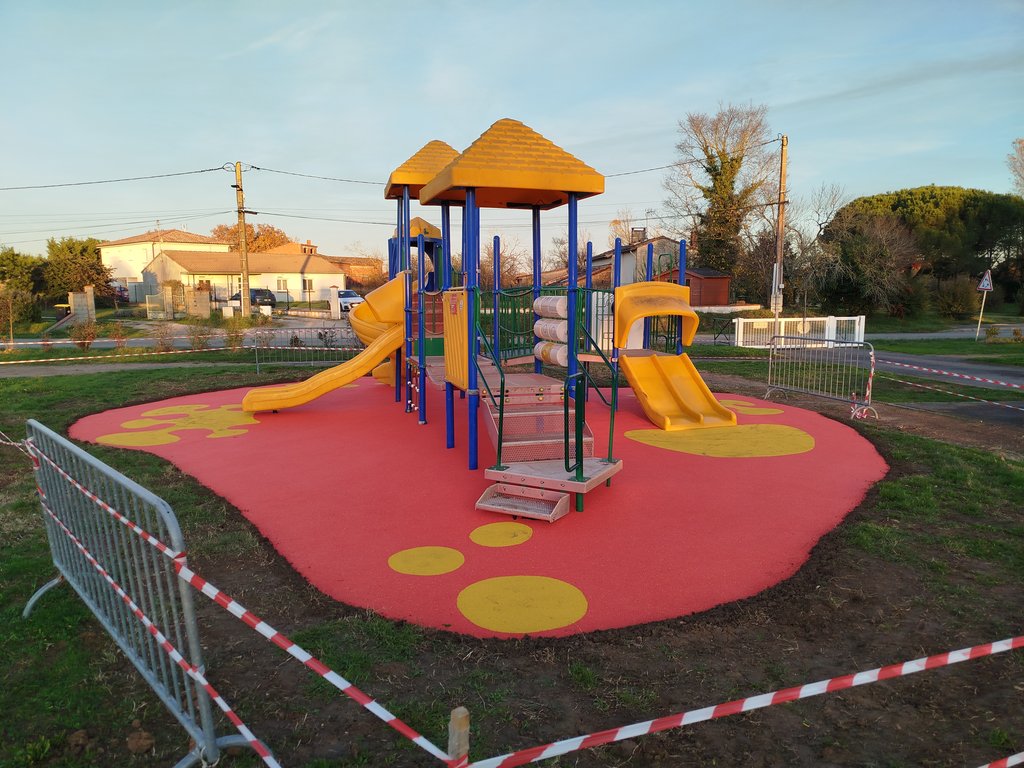 Bonne nouvelle, la structure de jeu a été reconnue conforme, et le sol doit maintenant être sec et praticable. Lorsque les barrières et la rubalise seront retirés, les enfants pourront en profiter en toute sécurité !