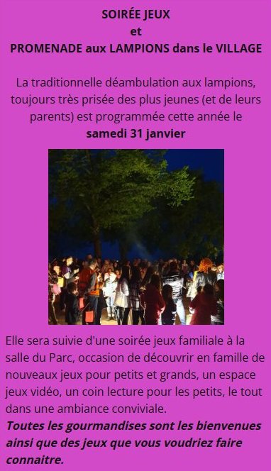 Le foyer rural vous propose sa traditionnelle promenade aux lampions suivie d'une soirée jeux pour les petits et pour les grands dans la salle du Parc.