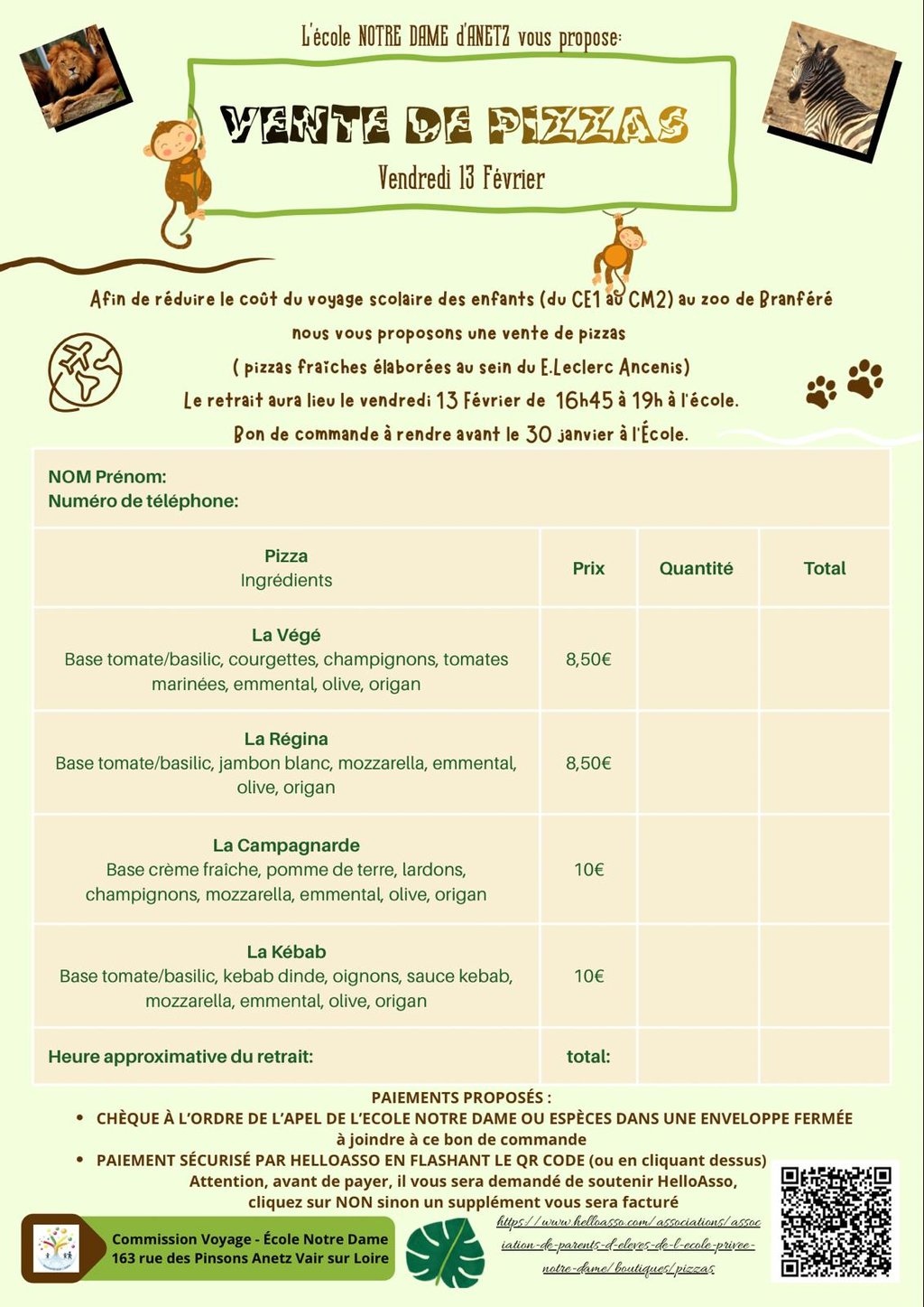 La commission voyages de l'école Notre-Dame organise une vente de pizzas afin de soutenir le financement du voyage scolaire des élèves du CE1 au CM2 au zoo de Branféré.