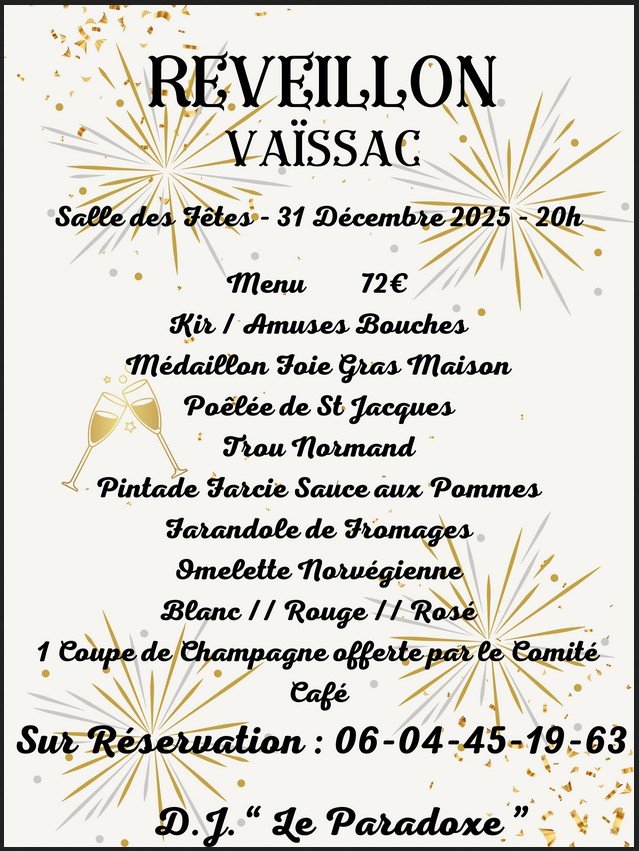 Le Comité des Fêtes de Vaïssac organise son Réveillon 2025 à la Salle des Fêtes.