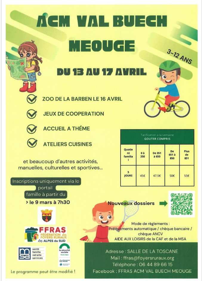 Les inscriptions pour le centre de loisirs de Val Buëch-Méouge pour les vacances du 13 au 17 Avril 2026 sont ouvertes ! Utilisez uniquement le portail famille à partir du 9 mars 2026 à 7h30.