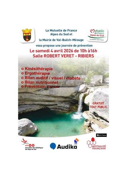 Kinésithérapie, ergothérapie, bilan auditif/visuel/diabète, bilan nutritionnel, prévention cancer. Journée de prévention tout public, proposée par la Mutuelle de France Alpes du Sud et la Mairie de Val Buëch-Méouge.