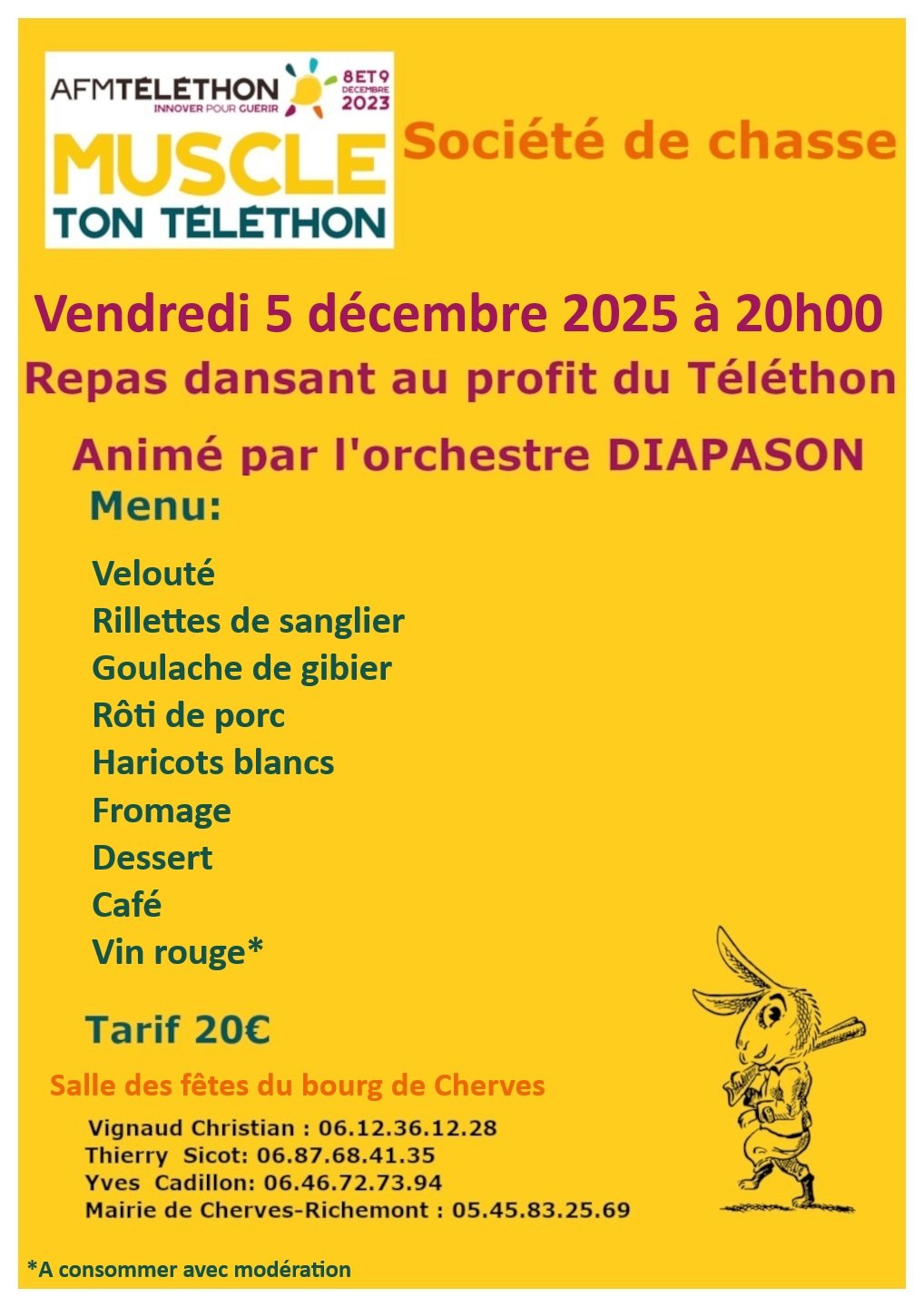 Comme chaque année, la société de chasse de Cherves-Richemont vous propose un repas dansant au profit du Téléthon