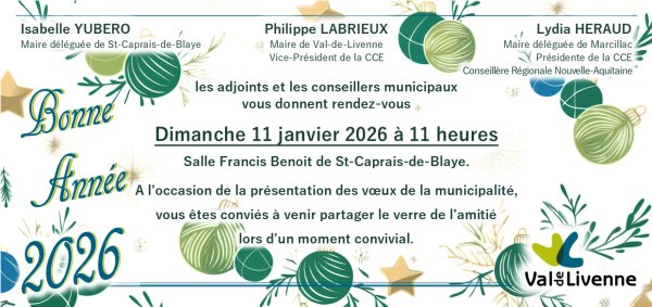 Vous êtes conviés à venir partager un moment convivial à l'occasion de la présentation des Vœux de la Municipalité de Val-de-Livenne.
