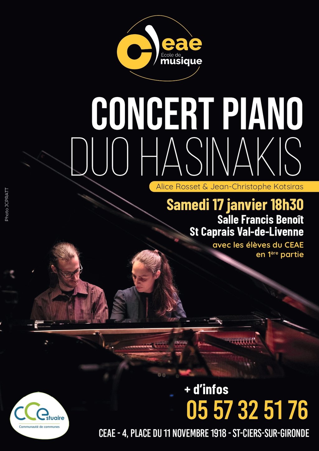 - Concert à 18h30 du duo Hasinakis, avec en premiÚre partie des élÚves du CEAE.